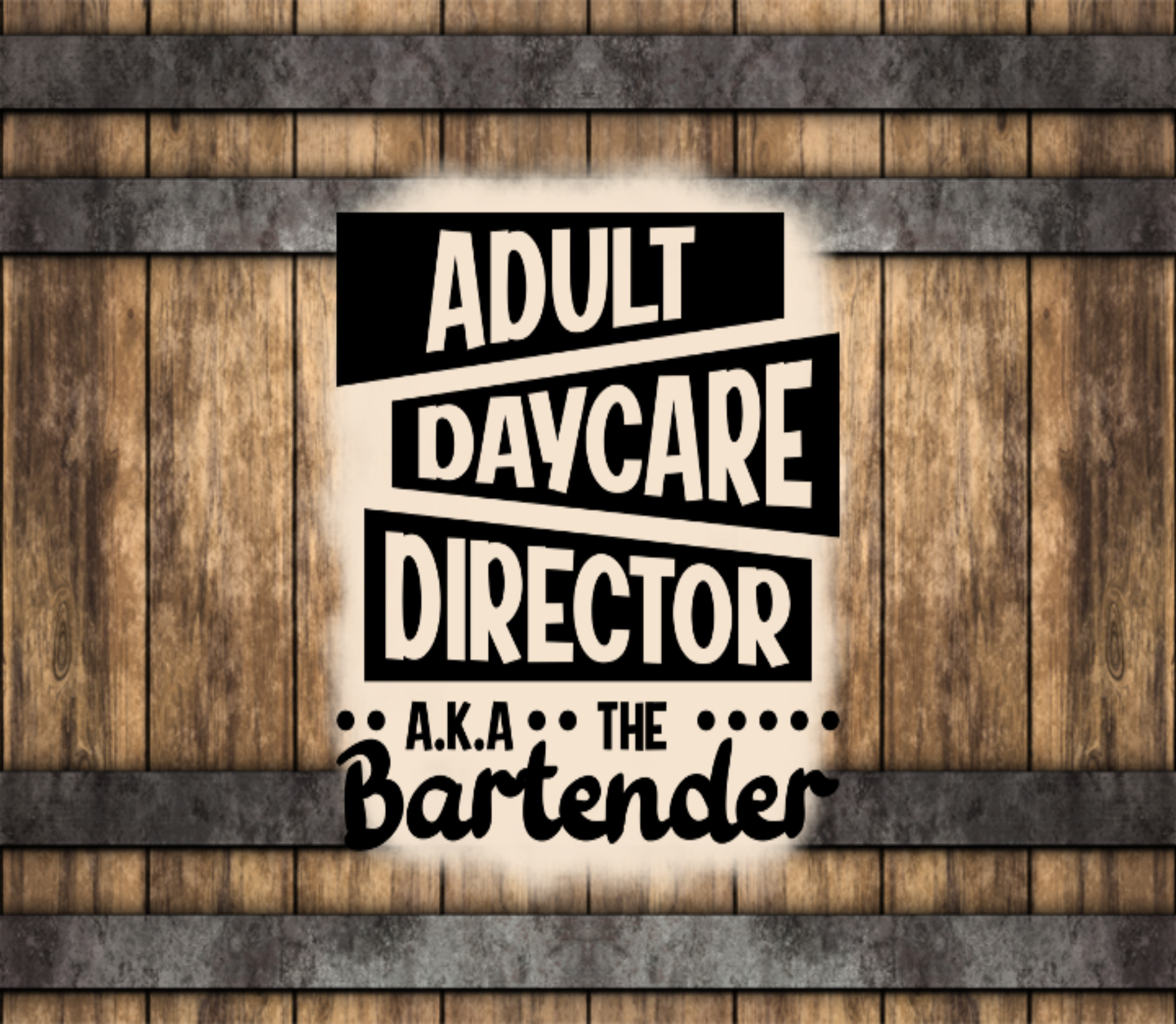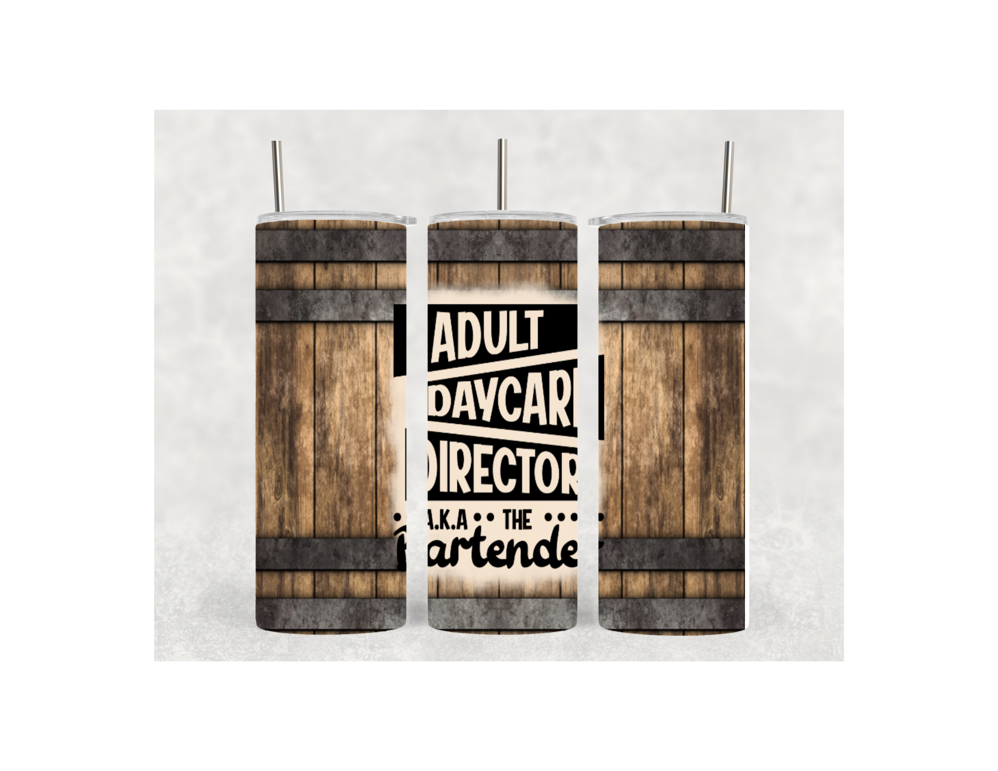Bartender tumbler with a beautiful wooden barrel background with black writing. Our Tumbler is metal. All tumblers come with a lid and a metal straw. It also has an anti-slip bottom to prevent the tumbler from sliding. The tumbler needs to be hand washed only.  All tumblers come shipped in its personal box and bow.