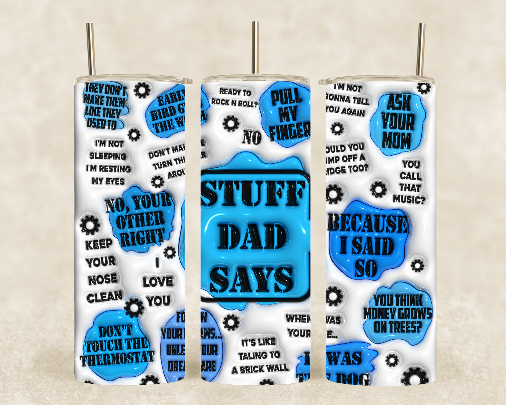 3D Stuff Dad Says tumbler with a white and blue background and black writing. Our Tumbler is metal. All tumblers come with a lid and a metal straw. It also has an anti-slip bottom to prevent the tumbler from sliding. The tumbler needs to be hand washed only. All tumblers come shipped in its personal box and bow.