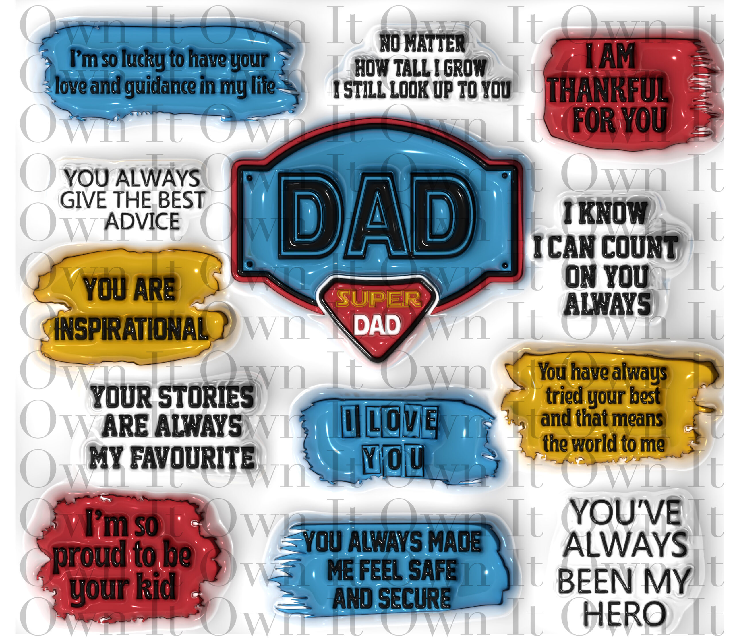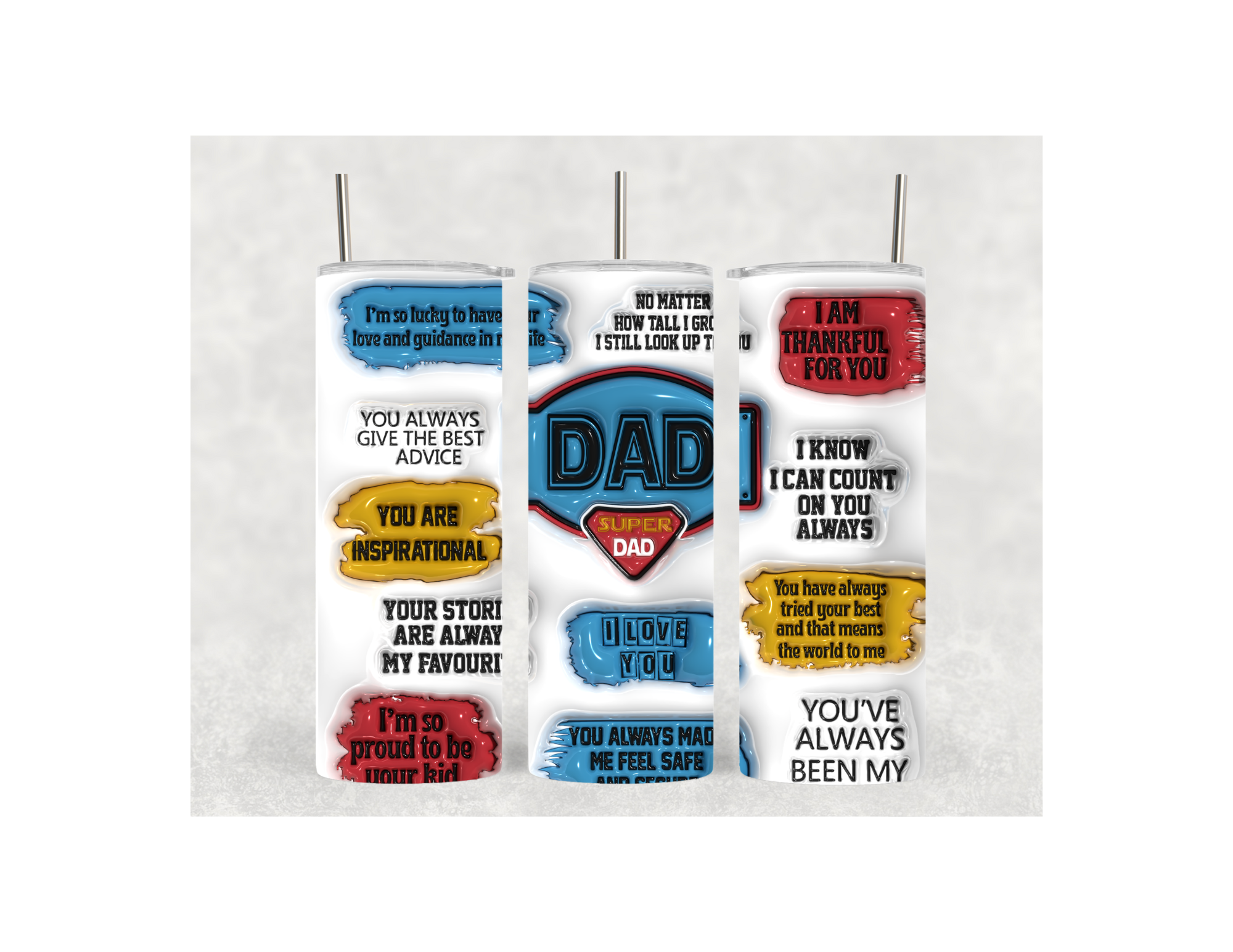 Super Dad 3D Tumbler with cool colorful bubbles with sayings in them with a white background. Our Tumbler is metal. All tumblers come with a lid and a metal straw. It also has an anti-slip bottom to prevent the tumbler from sliding. The tumbler needs to be hand washed only. All tumblers come shipped in its personal box and bow.