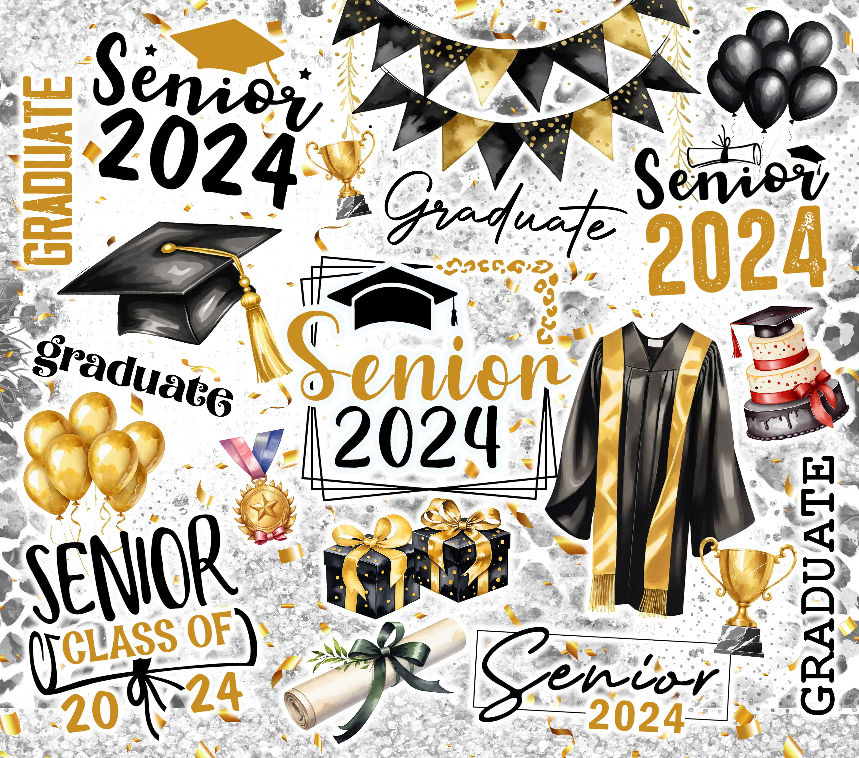 Black and Gold Senior Graduation tumbler with a white background with printed designs all over the tumbler. Our Tumbler is metal. All tumblers come with a lid and a metal straw. It also has an anti-slip bottom to prevent the tumbler from sliding. The tumbler needs to be hand washed only. All tumblers come shipped in its personal box and bow. This design can be switched to any graduation year you need.