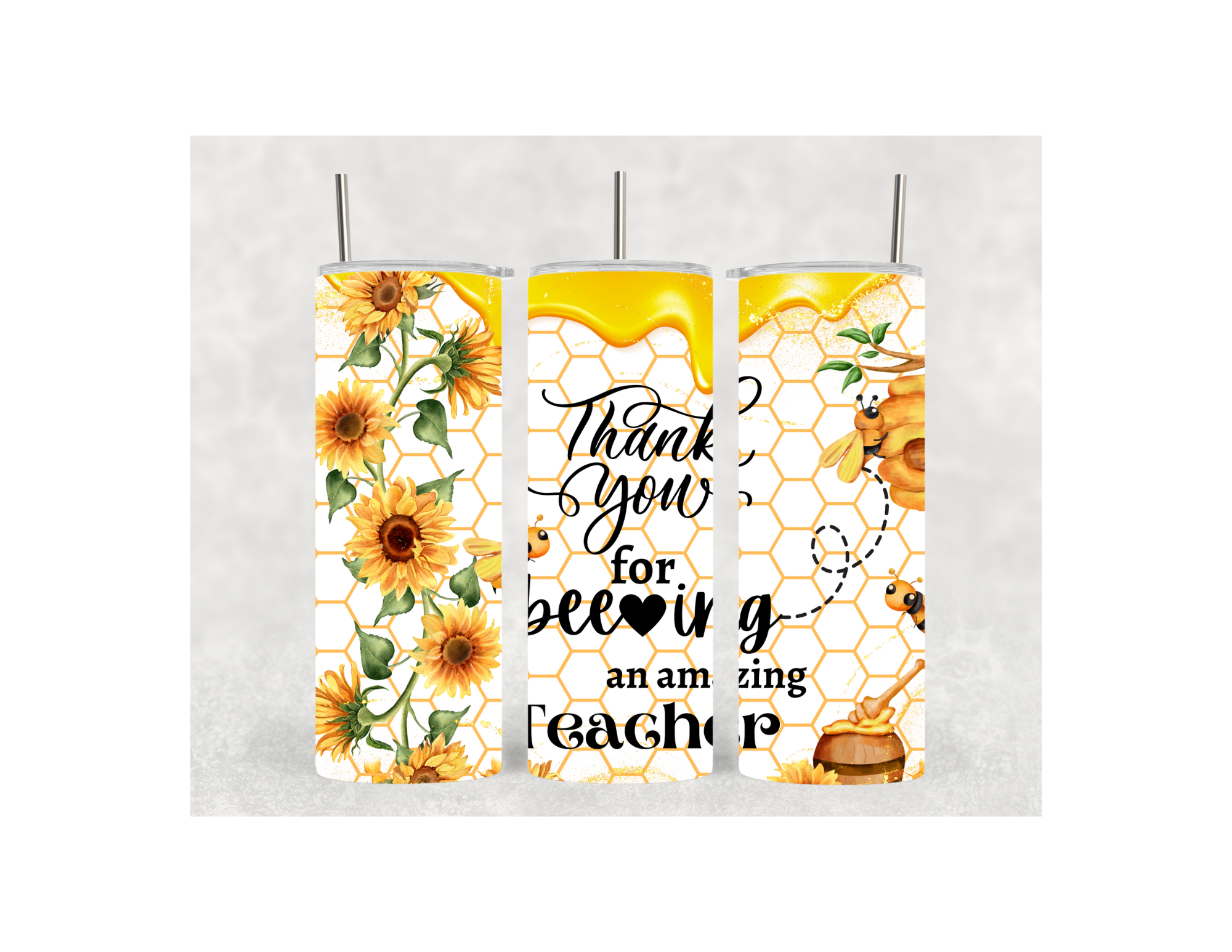 Thank You For Beeing An Amazing Teacher Tumbler with beautiful sunflowers and a honeycomb background. Our Tumbler is metal. All tumblers come with a lid and a metal straw. It also has an anti-slip bottom to prevent the tumbler from sliding. The tumbler needs to be hand washed only. All tumblers come shipped in its personal box and bow.