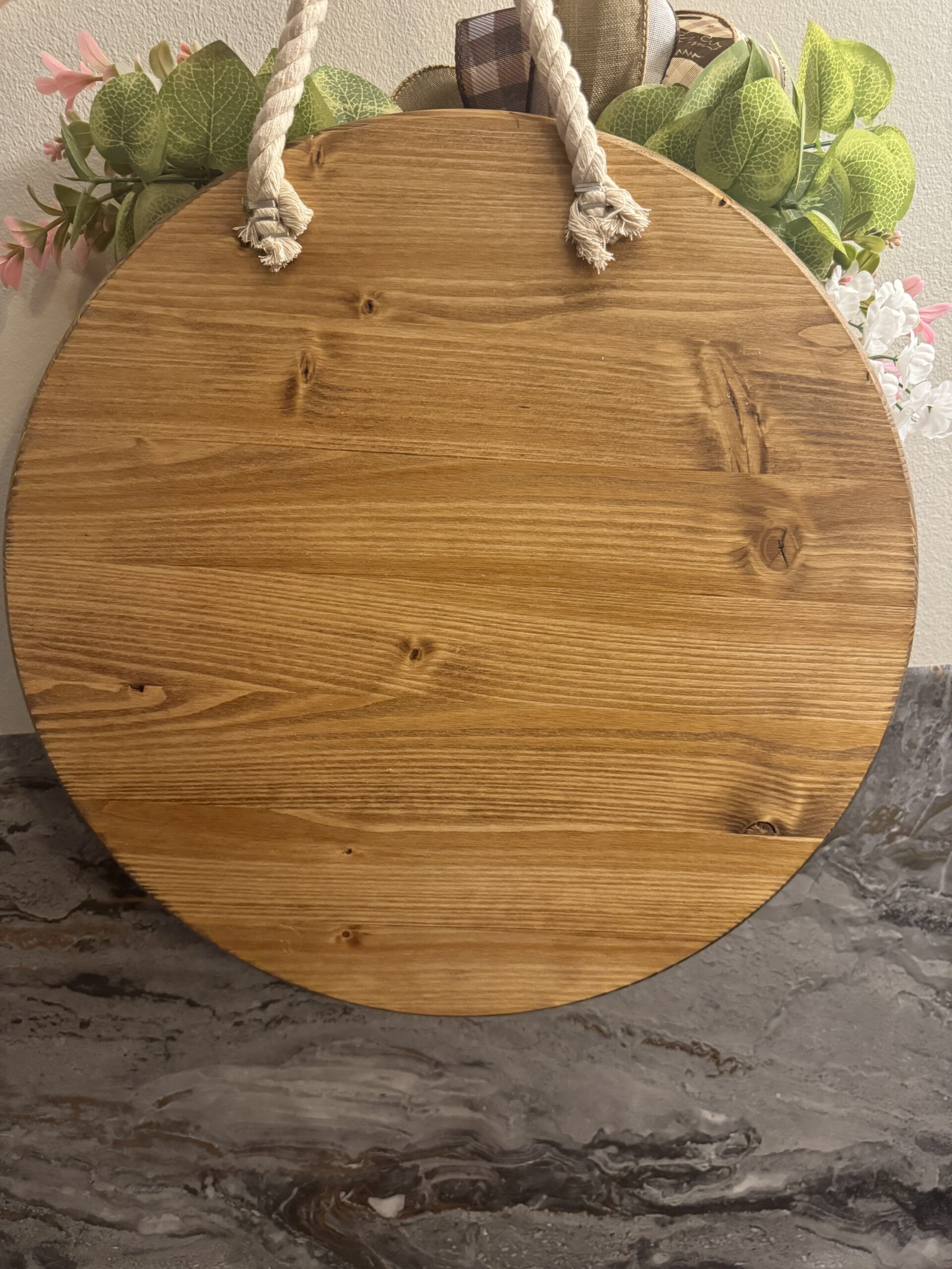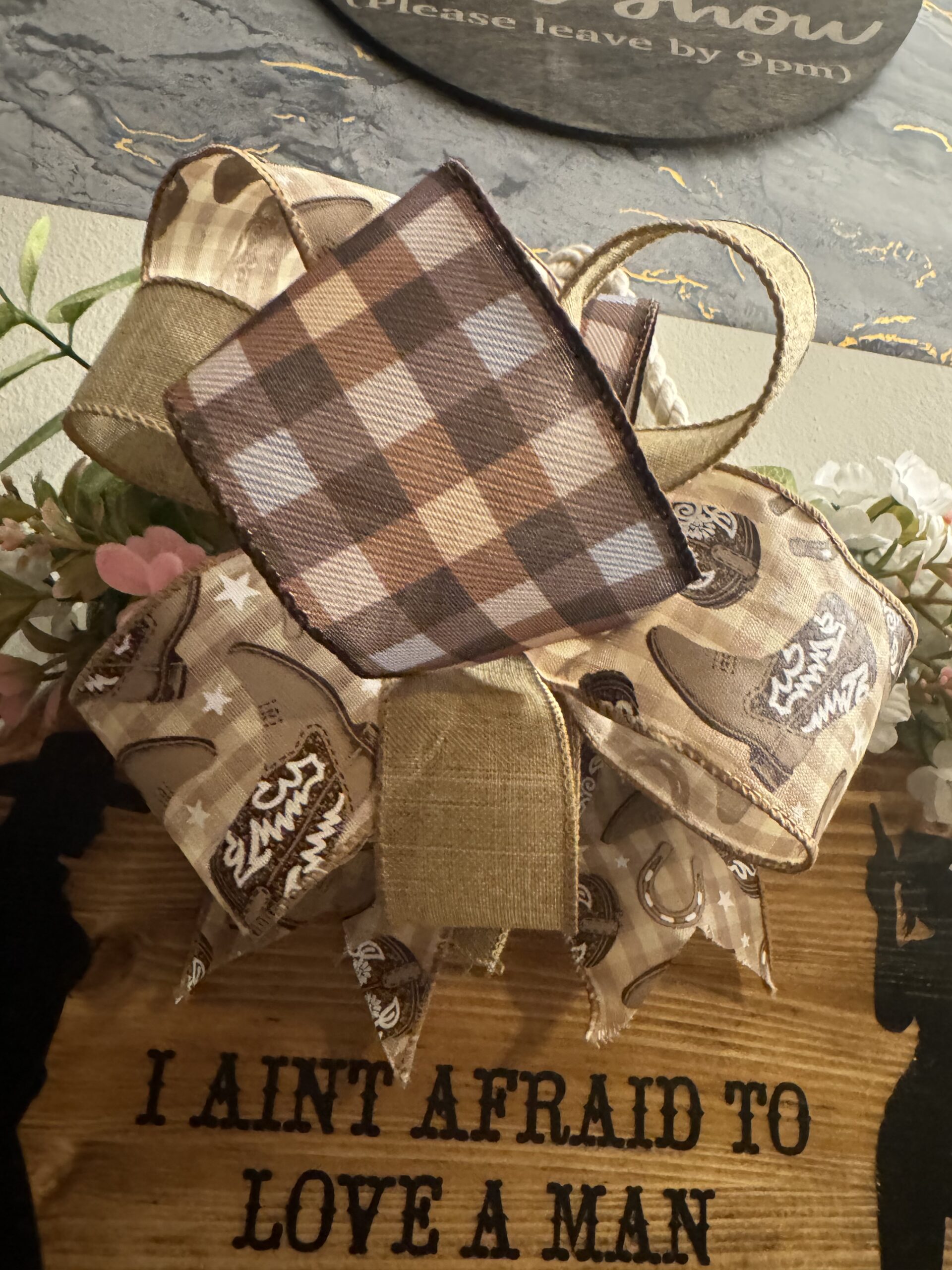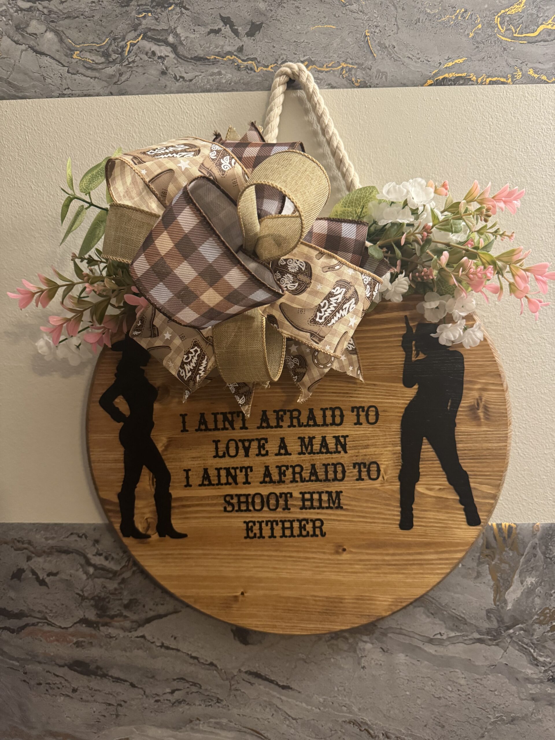 This is a beautiful stained sign that has a sarcastic saying. This has a beautiful bow that has cowgirl boots and checkered design ribbon. If you are one that has a funny sense of humor than this is the sign for you. All of our boards are weather sealed.