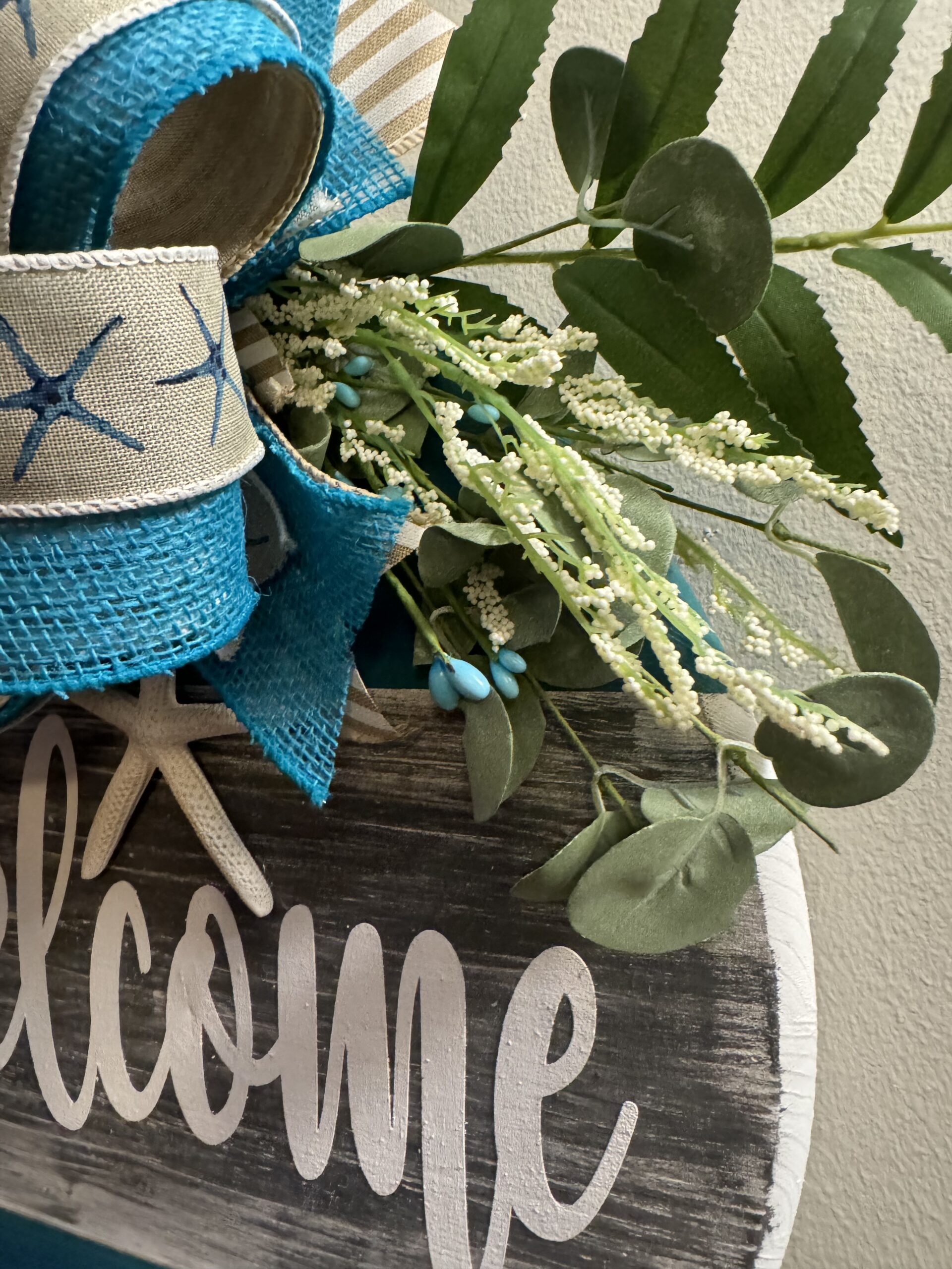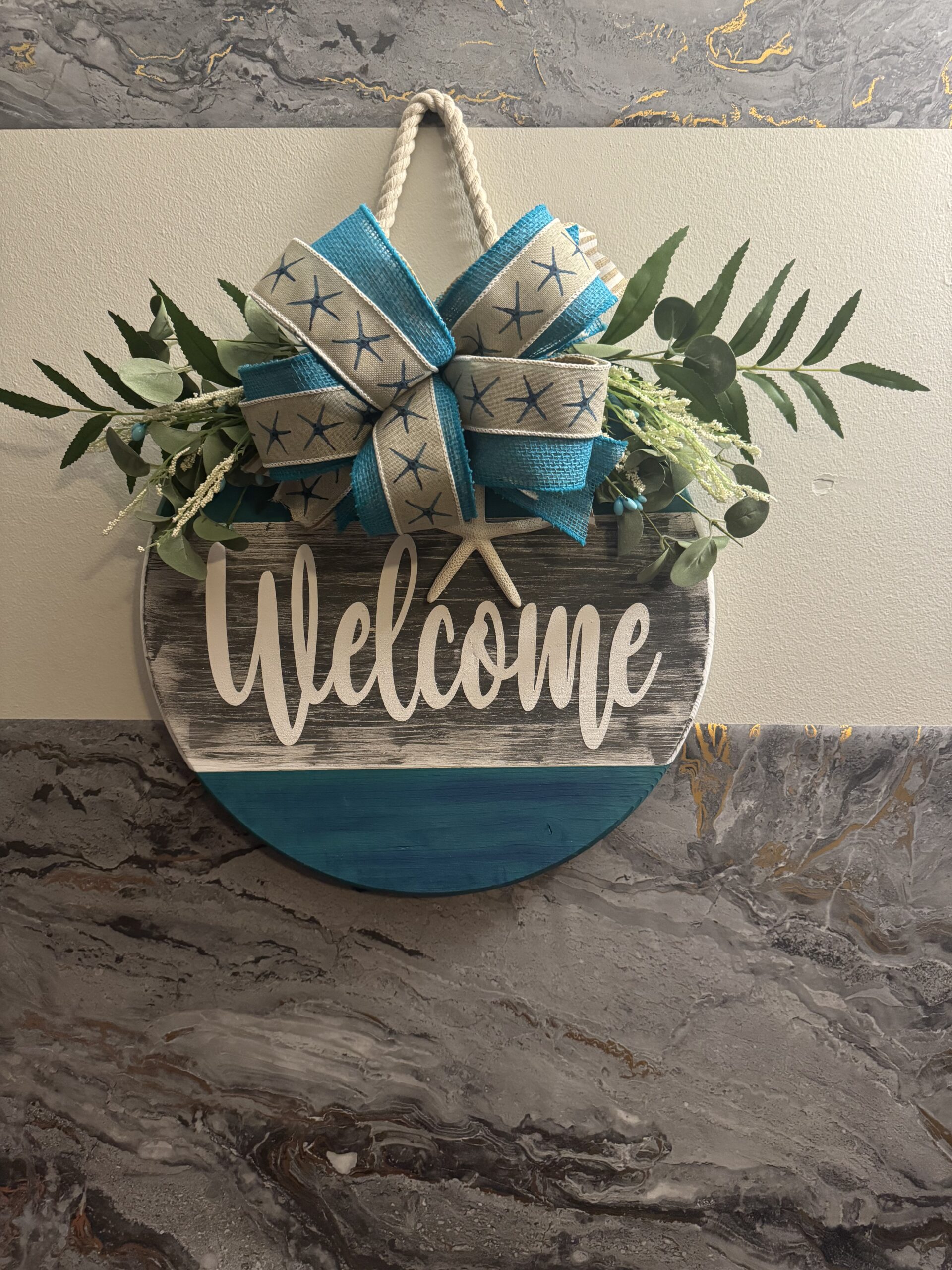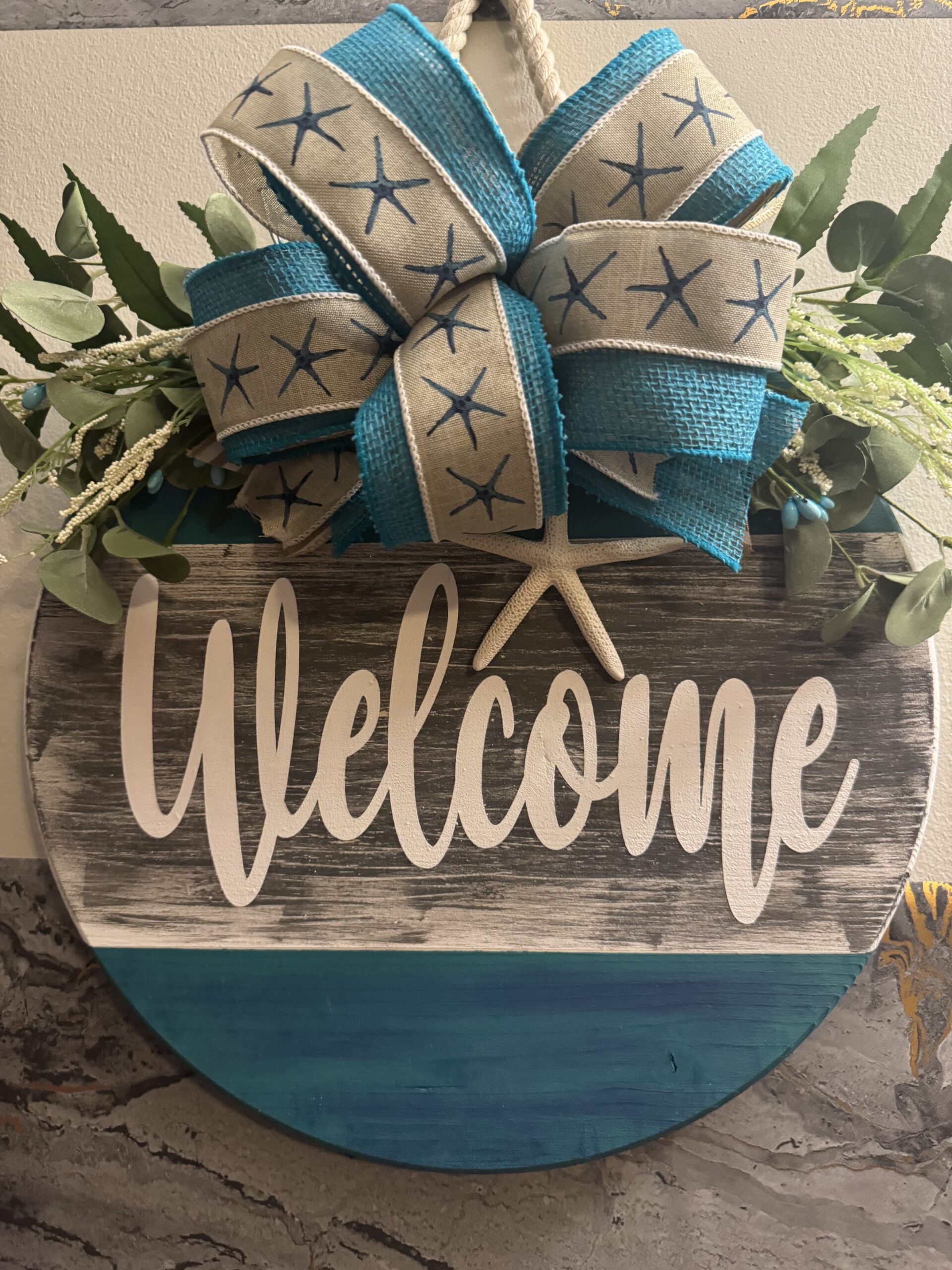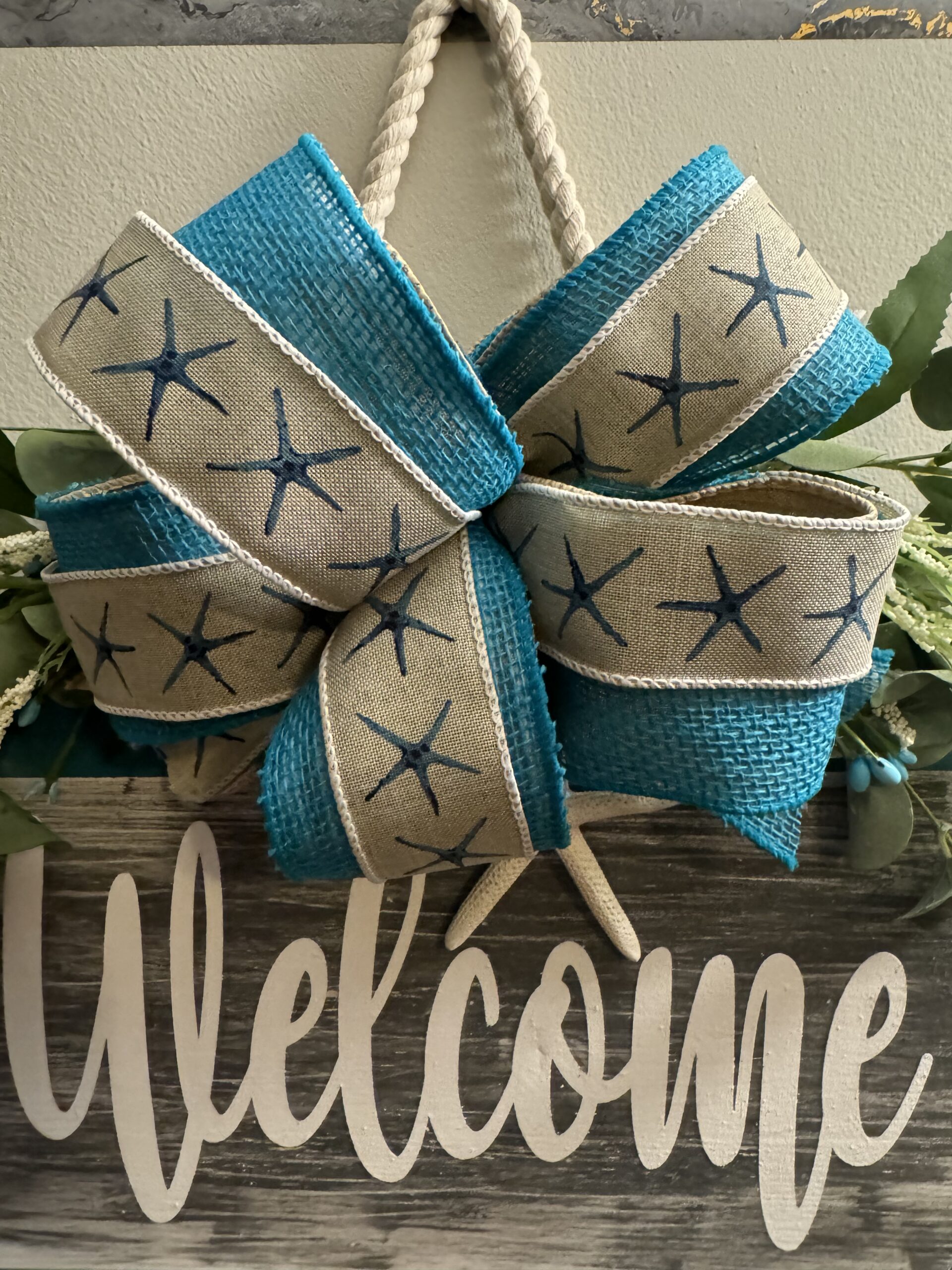 🐚 Welcome Starfish Sign – Wooden Welcome Sign with Teal Ribbon and Star Design for Home Decor