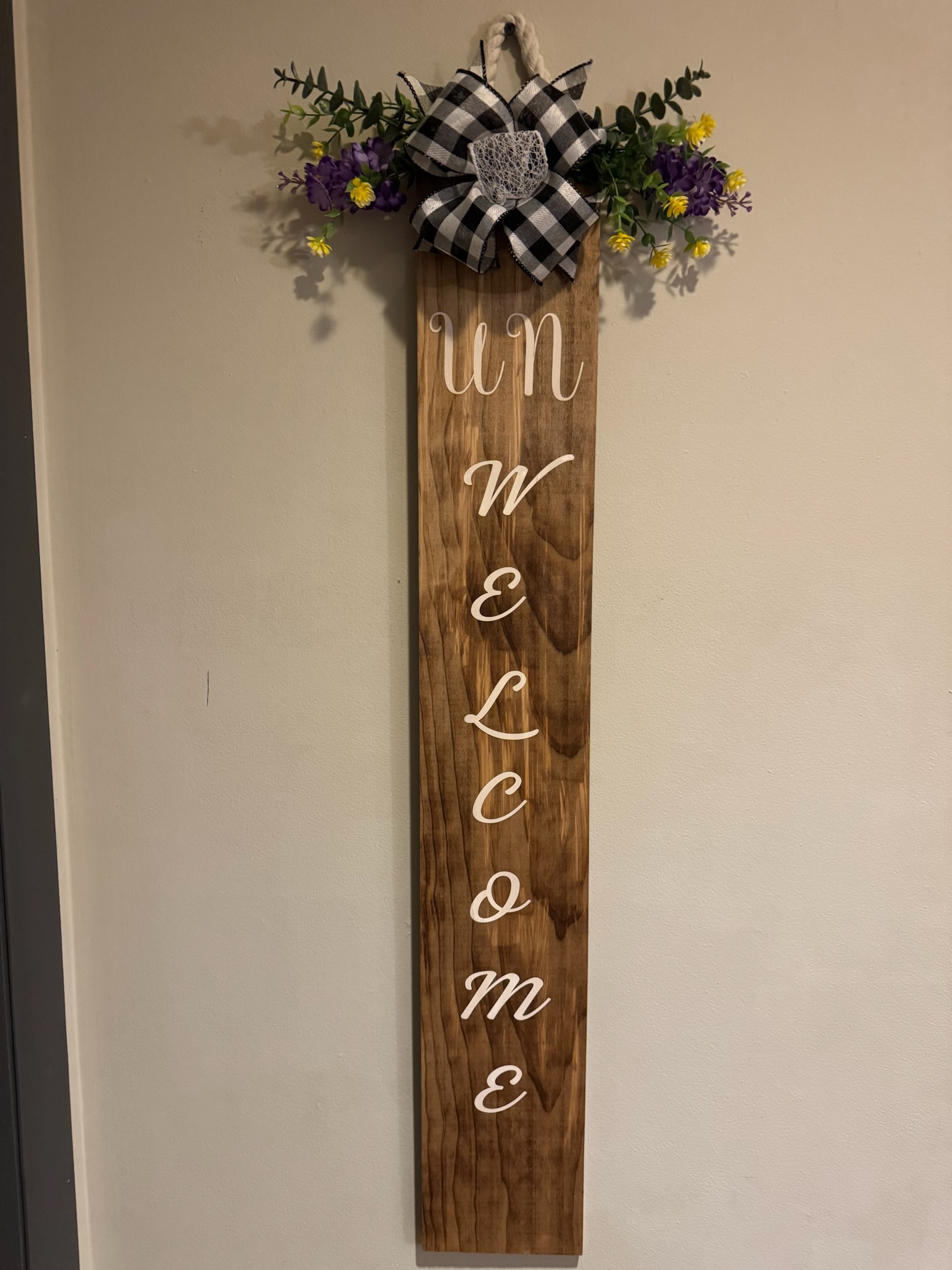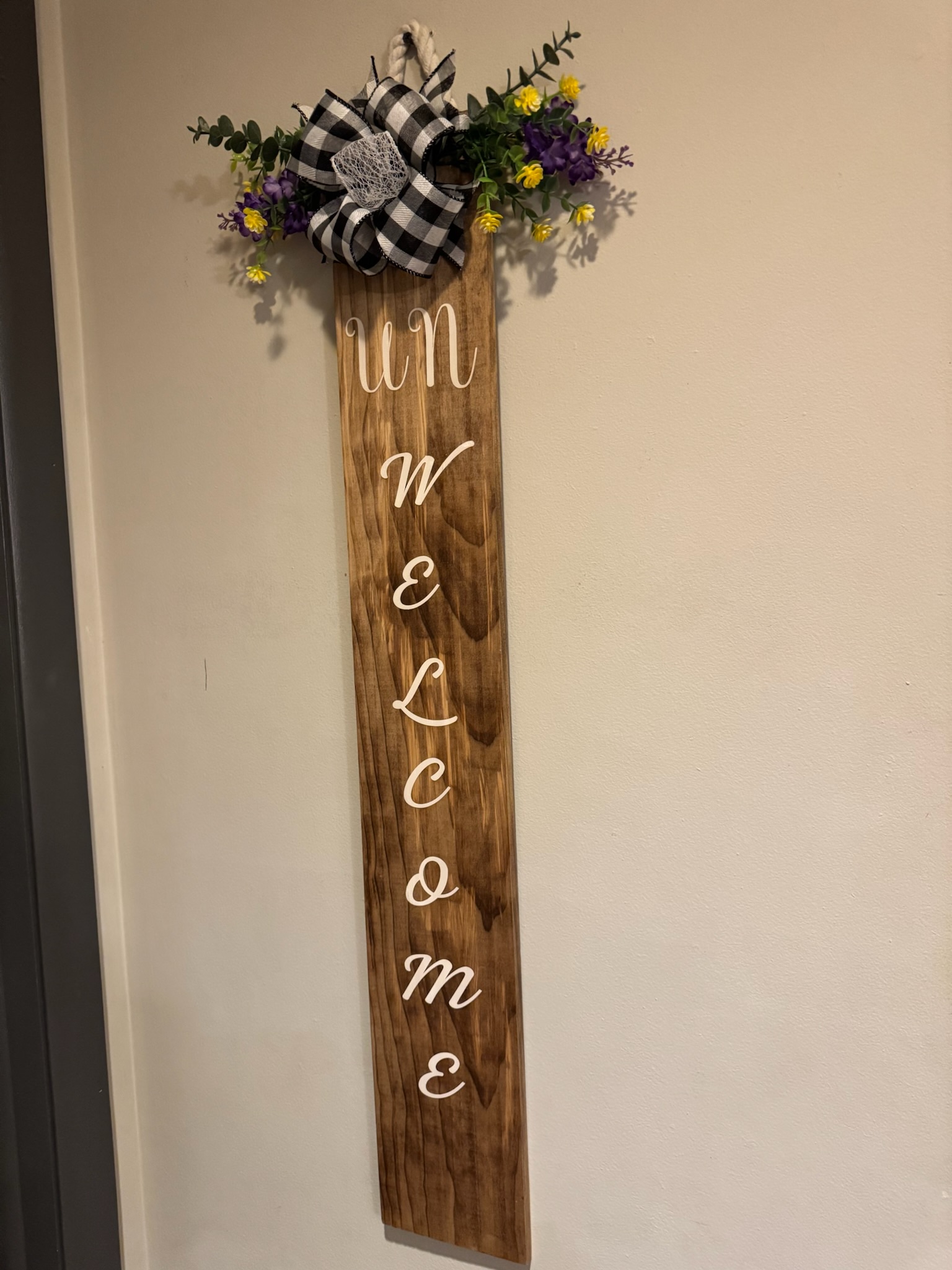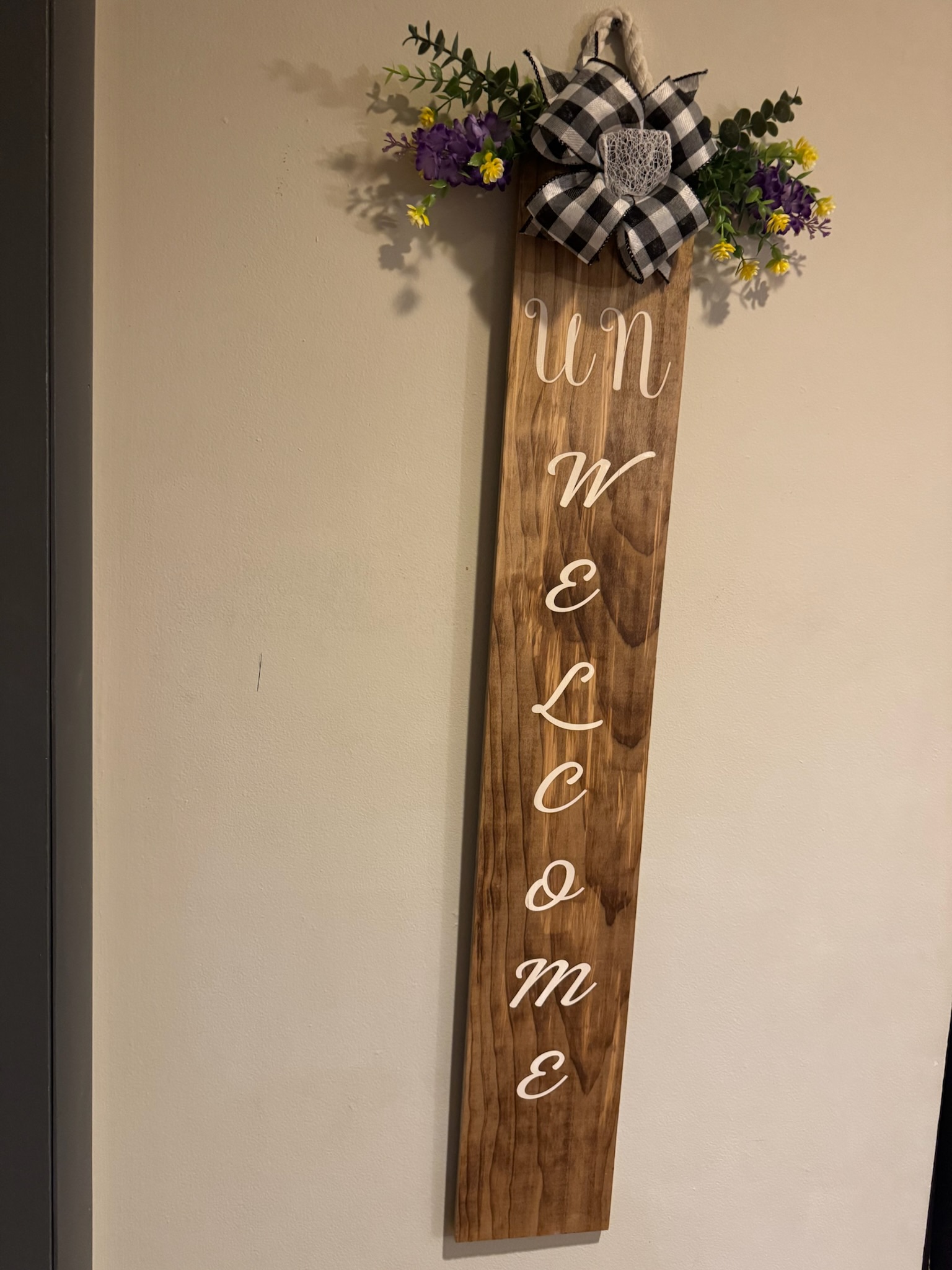 This is beautifully stained piece of wood with a sarcastic saying “Un Welcome” written in white. If you have that sense of humor, this is the sign just for you. This board is weather-sealed and ready to be hung at your home.
