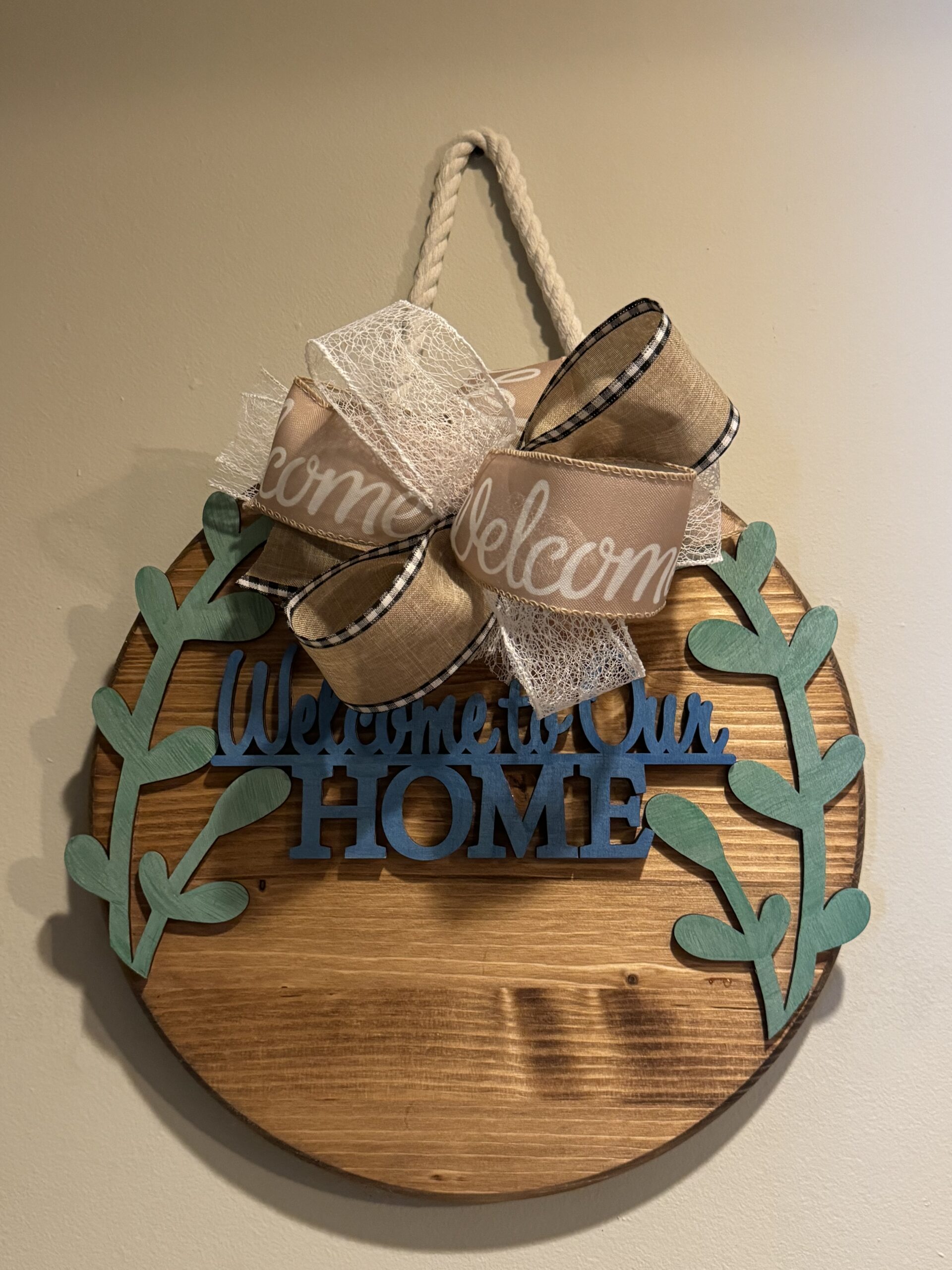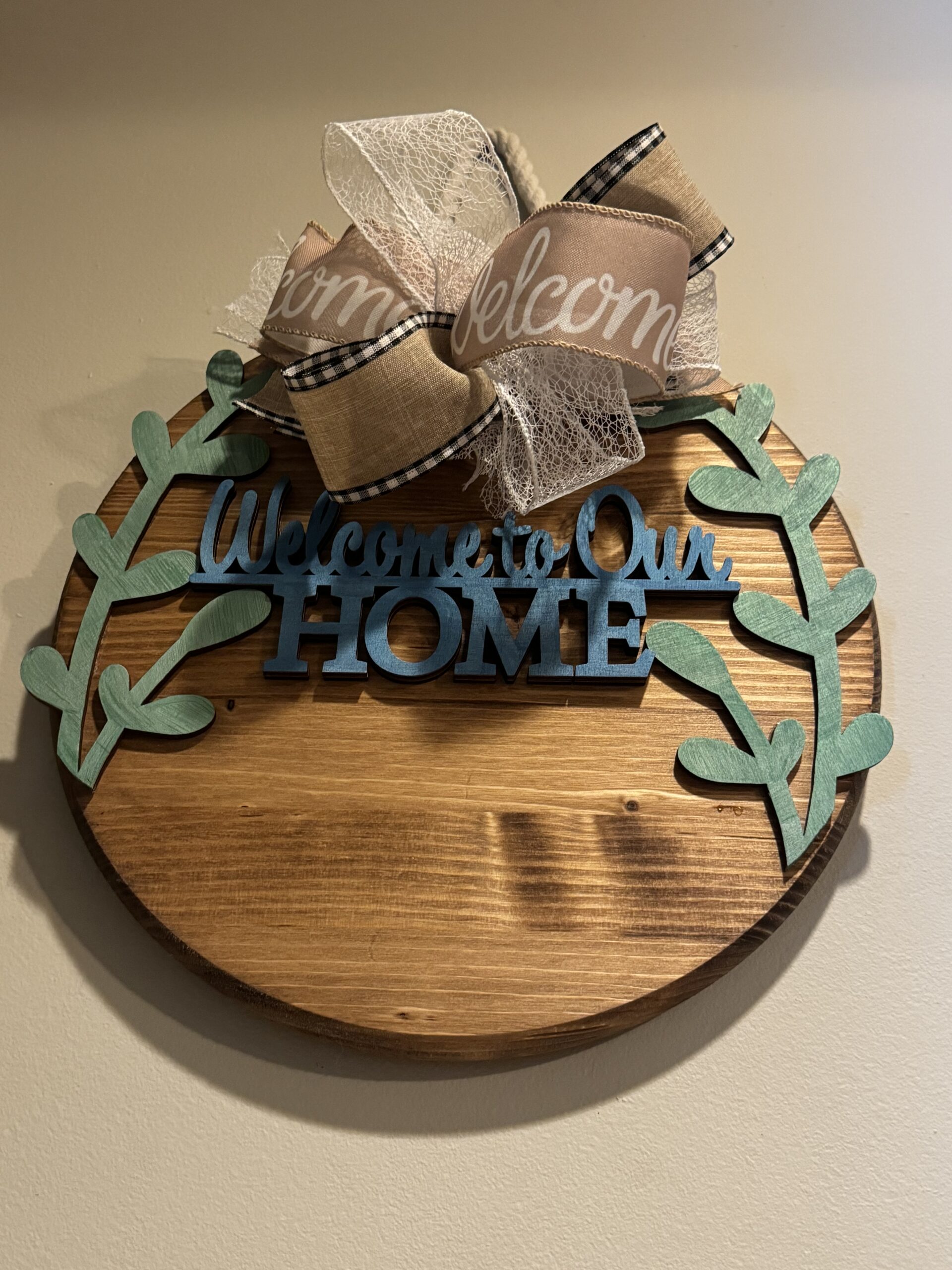 Here is cute sign that has cut outs that say Welcome to Our home, along with cutout floral on each side. This board is beautifully stained. All our boards are weathered seal and ready to be placed in your forever home.