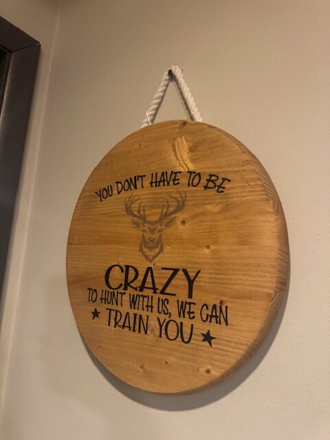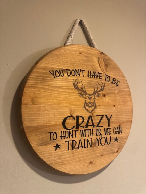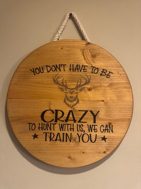 Calling all hunters. Here is a sign that fits you perfectly. This board is painted and is beautifully stained. This board is a 15 inch round 1 inch thick. This board is weather-proofed.